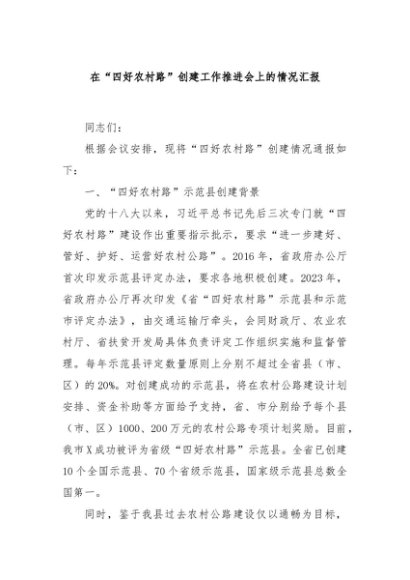 / 【七哥公文】2024年:在“四好农村路”创建工作推进会上的情况汇报+更多免费公文+VX:QiGeGongWen2024