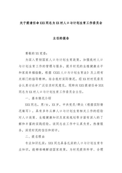【七哥公文】2024年:关于提请任命XXX同志为XX村人口与计划生育工作委员会主任的报告+更多免费公文+VX:QiGeGongWen2024