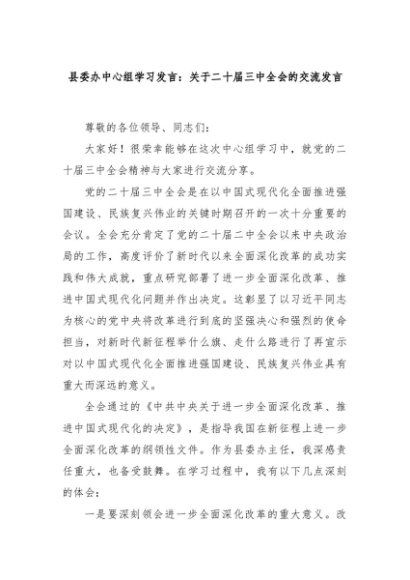 【七哥公文】2024年:县委办中心组学习发言:关于二十届三中全会的交流发言+更多免费公文+VX:QiGeGongWen2024