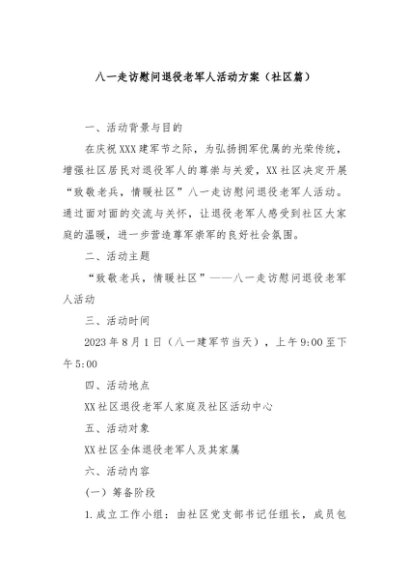 / 【七哥公文】2024年:八一走访慰问退役老军人活动方案(社区篇)+更多免费公文+VX:QiGeGongWen2024