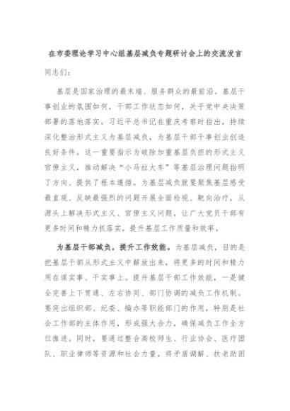 【七哥公文】2024年:在市委理论学习中心组基层减负专题研讨会上的交流发言+更多免费公文+VX:QiGeGongWen2024