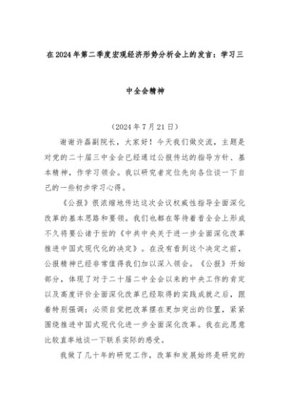 【七哥公文】2024年:在2024年第二季度宏观经济形势分析会上的发言:学习三中全会精神+更多免费公文+VX:QiGeGongWen2024