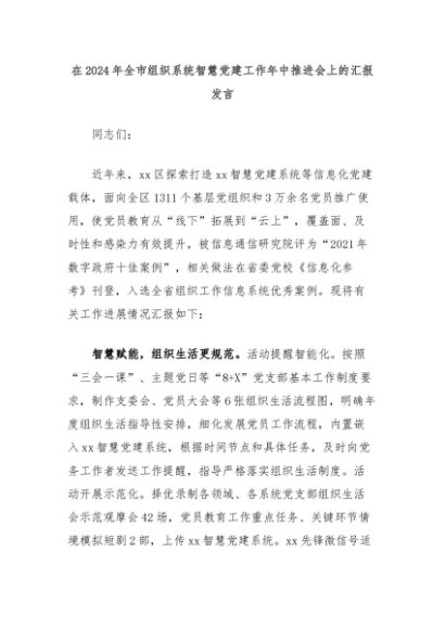 【七哥公文】2024年:在2024年全市组织系统智慧党建工作年中推进会上的汇报发言+更多免费公文+VX:QiGeGongWen2024