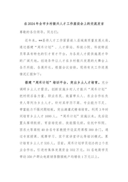 【七哥公文】2024年:在2024年全市乡村振兴人才工作座谈会上的交流发言+更多免费公文+VX:QiGeGongWen2024