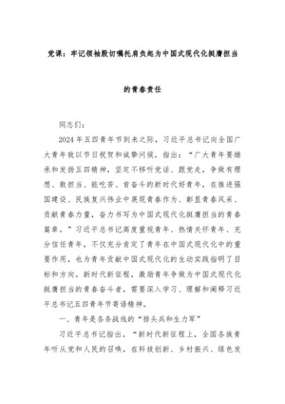 【七哥公文】2024年:党课:牢记领袖殷切嘱托肩负起为中国式现代化挺膺担当的青春责任+更多免费公文+VX:QiGeGongWen2024
