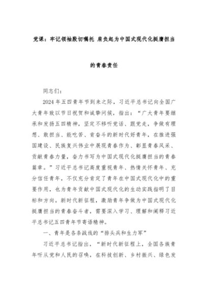 【七哥公文】2024年:党课:牢记领袖殷切嘱托 肩负起为中国式现代化挺膺担当的青春责任+更多免费公文+VX:QiGeGongWen2024