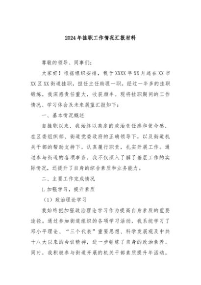 / 【七哥公文】2024年:2024年挂职工作情况汇报材料+更多免费公文+VX:QiGeGongWen2024