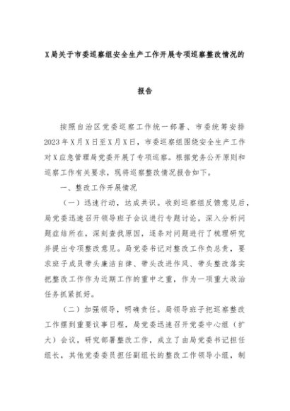 【七哥公文】2024年:X局关于市委巡察组安全生产工作开展专项巡察整改情况的报告+更多免费公文+VX:QiGeGongWen2024
