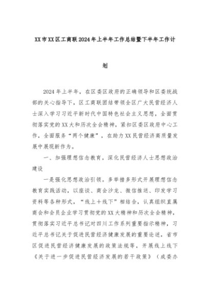 【七哥公文】2024年:XX市XX区工商联2024年上半年工作总结暨下半年工作计划+更多免费公文+VX:QiGeGongWen2024