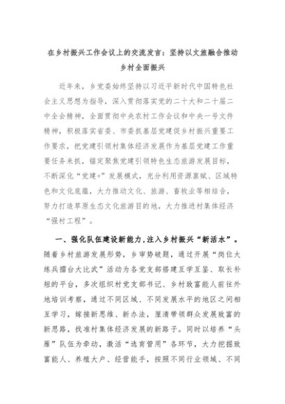 【七哥公文】2024年:在乡村振兴工作会议上的交流发言:坚持以文旅融合推动乡村全面振兴+更多免费公文+VX:QiGeGongWen2024
