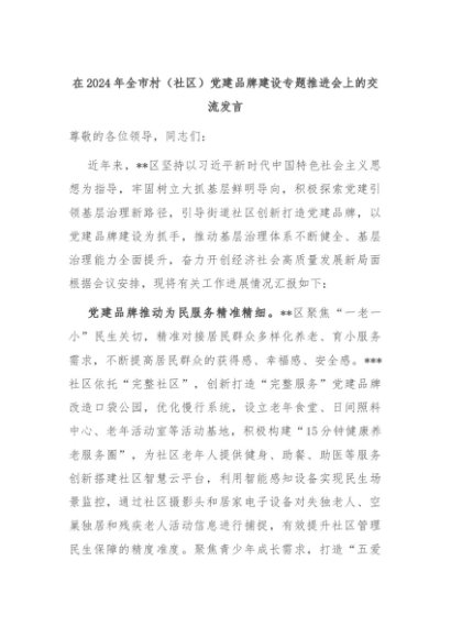 【七哥公文】2024年:在2024年全市村(社区)党建品牌建设专题推进会上的交流发言+更多免费公文+VX:QiGeGongWen2024
