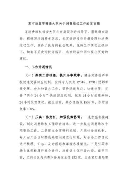 / 【七哥公文】2024年:某市场监管稽查大队关于消费维权工作的发言稿+更多免费公文+VX:QiGeGongWen2024