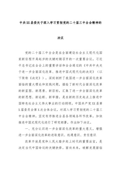 【七哥公文】2024年:中共XX县委关于深入学习贯彻党的二十届三中全会精神的决议+更多免费公文+VX:QiGeGongWen2024