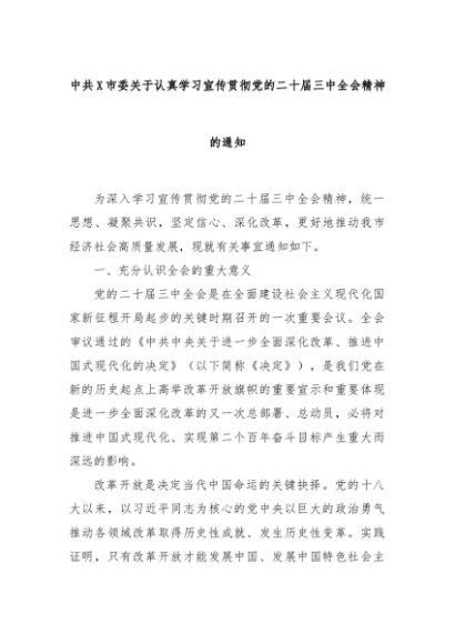 【七哥公文】2024年:中共X市委关于认真学习宣传贯彻党的二十届三中全会精神的通知+更多免费公文+VX:QiGeGongWen2024