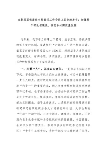 【七哥公文】2024年:在抓基层党建促乡村振兴工作会议上的交流发言:加强村干部队伍建设,推动乡村高质量发展+更多免费公文+VX:QiGeGongWen2024