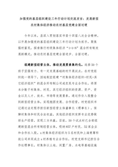 【七哥公文】2024年:加强党的基层组织建设三年行动计划交流发言:发展新型农村集体经济推动农村基层党建全面过硬+更多免费公文+VX:QiGeGongWen2024