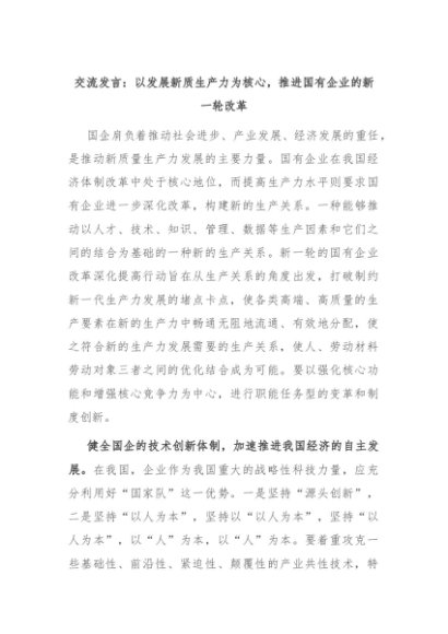 【七哥公文】2024年:交流发言:以发展新质生产力为核心,推进国有企业的新一轮改革+更多免费公文+VX:QiGeGongWen2024