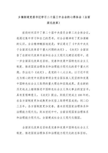 【七哥公文】2024年:乡镇街道党委书记学习二十届三中全会的心得体会(全面深化改革)+更多免费公文+VX:QiGeGongWen2024