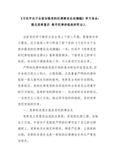 【七哥公文】2024年:《习近平关于全面加强党的纪律建设论述摘编》学习体会:强化党章意识 做守纪律讲规矩的明白人+更多免费公文+VX:QiGeGongWen2024