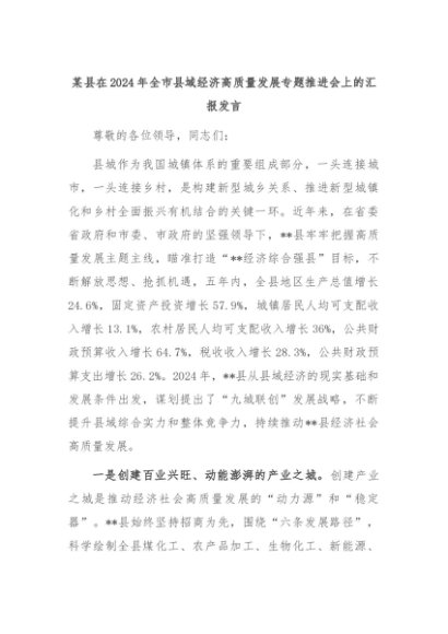 【七哥公文】2024年:某县在2024年全市县域经济高质量发展专题推进会上的汇报发言+更多免费公文+VX:QiGeGongWen2024
