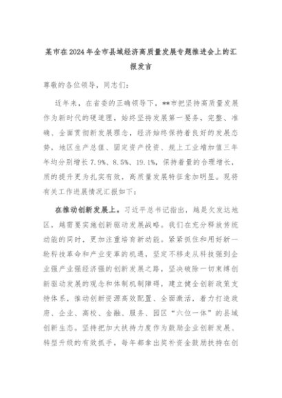 【七哥公文】2024年:某市在2024年全市县域经济高质量发展专题推进会上的汇报发言+更多免费公文+VX:QiGeGongWen2024
