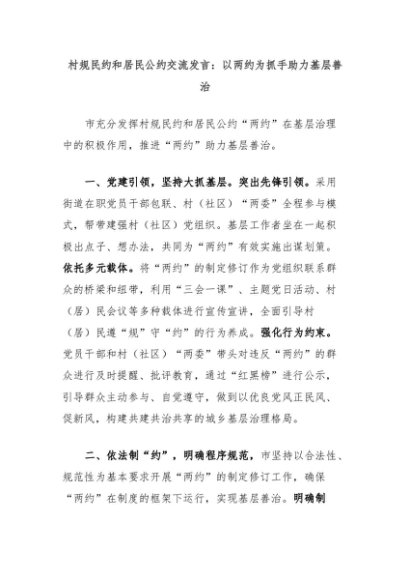 【七哥公文】2024年:村规民约和居民公约交流发言:以两约为抓手助力基层善治+更多免费公文+VX:QiGeGongWen2024