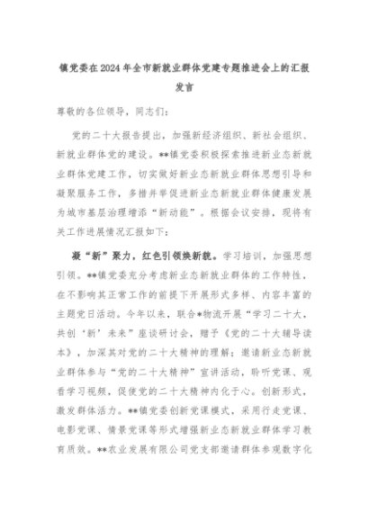 【七哥公文】2024年:镇党委在2024年全市新就业群体党建专题推进会上的汇报发言+更多免费公文+VX:QiGeGongWen2024