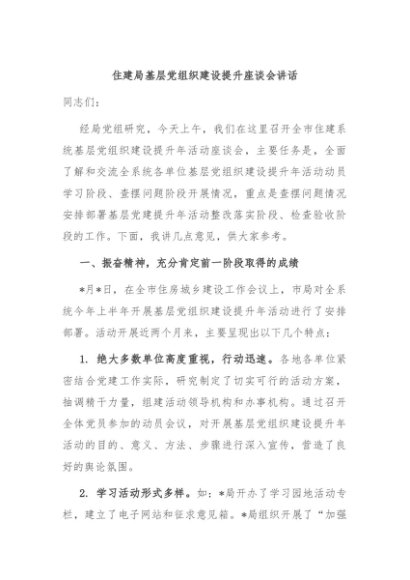 / 【七哥公文】2024年:住建局基层党组织建设提升座谈会讲话+更多免费公文+VX:QiGeGongWen2024