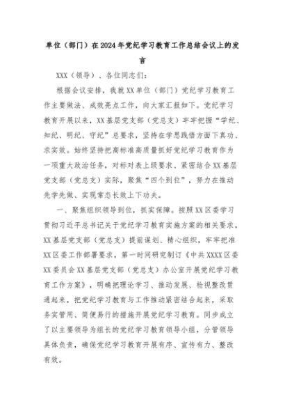 【七哥公文】2024年:单位(部门)在2024年党纪学习教育工作总结会议上的发言+更多免费公文+VX:QiGeGongWen2024