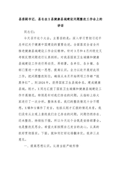 【七哥公文】2024年:县委副书记、县长在X县健康县城建设问题整改工作会上的讲话+更多免费公文+VX:QiGeGongWen2024