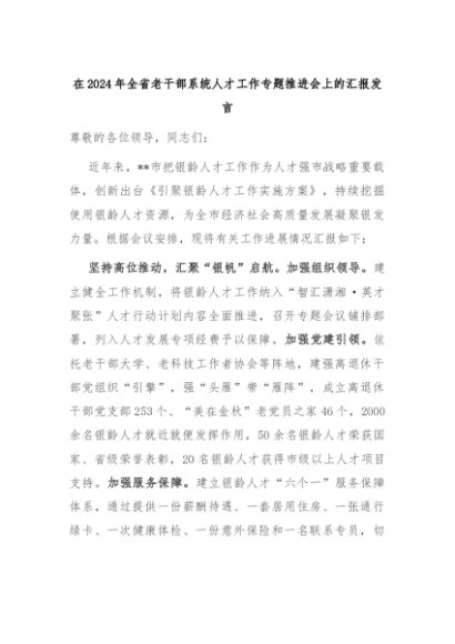 【七哥公文】2024年:在2024年全省老干部系统人才工作专题推进会上的汇报发言+更多免费公文+VX:QiGeGongWen2024