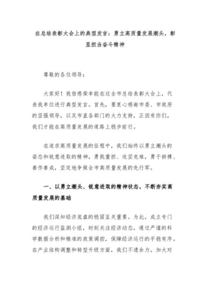 【七哥公文】2024年:在总结表彰大会上的典型发言:勇立高质量发展潮头,彰显担当奋斗精神+更多免费公文+VX:QiGeGongWen2024