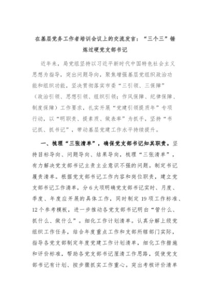 【七哥公文】2024年:在基层党务工作者培训会议上的交流发言:“三个三”锤炼过硬党支部书记+更多免费公文+VX:QiGeGongWen2024