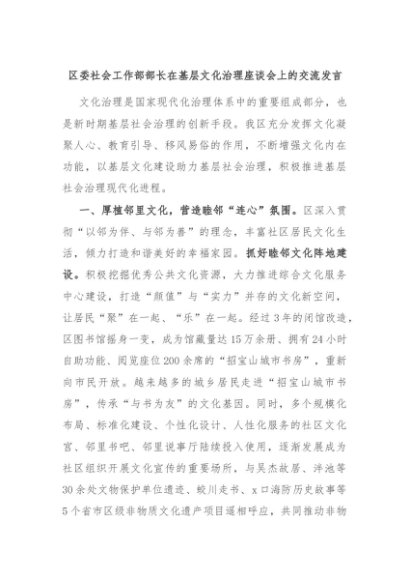 【七哥公文】2024年:区委社会工作部部长在基层文化治理座谈会上的交流发言+更多免费公文+VX:QiGeGongWen2024