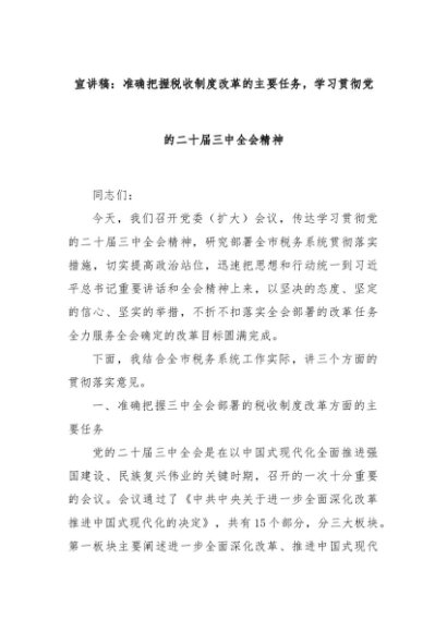 【七哥公文】2024年:宣讲稿:准确把握税收制度改革的主要任务,学习贯彻党的二十届三中全会精神+更多免费公文+VX:QiGeGongWen2024