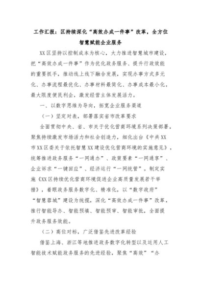 【七哥公文】2024年:工作汇报:区持续深化“高效办成一件事”改革,全方位智慧赋能企业服务+更多免费公文+VX:QiGeGongWen2024