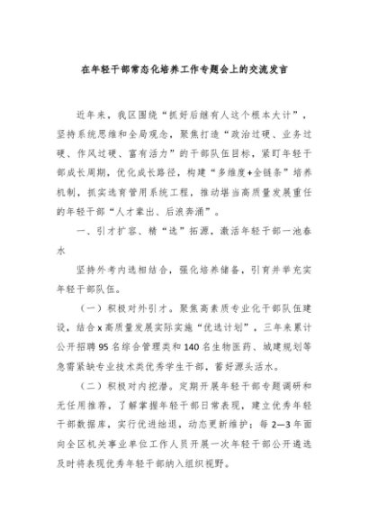 / 【七哥公文】2024年:在年轻干部常态化培养工作专题会上的交流发言+更多免费公文+VX:QiGeGongWen2024