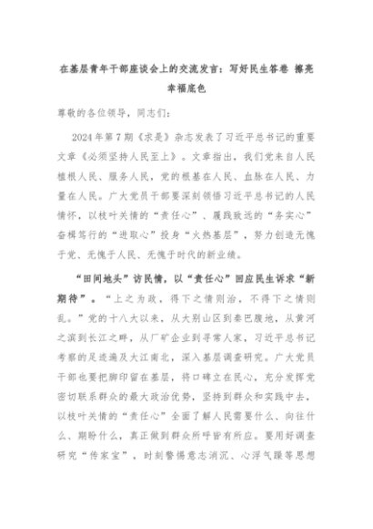 【七哥公文】2024年:在基层青年干部座谈会上的交流发言:写好民生答卷 擦亮幸福底色+更多免费公文+VX:QiGeGongWen2024