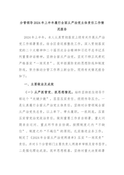 【七哥公文】2024年:分管领导2024年上半年履行全面从严治党主体责任工作情况报告+更多免费公文+VX:QiGeGongWen2024