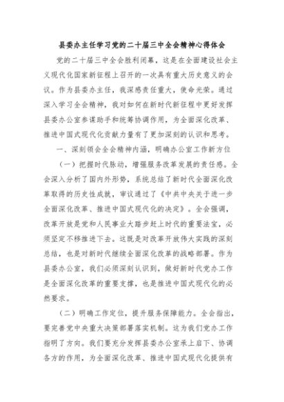 / 【七哥公文】2024年:县委办主任学习党的二十届三中全会精神心得体会+更多免费公文+VX:QiGeGongWen2024