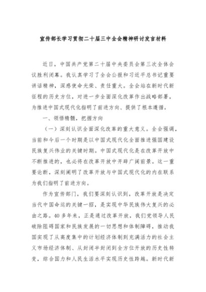 / 【七哥公文】2024年:宣传部长学习贯彻二十届三中全会精神研讨发言材料+更多免费公文+VX:QiGeGongWen2024