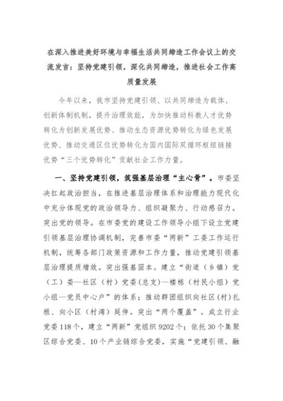 【七哥公文】2024年:在深入推进美好环境与幸福生活共同缔造工作会议上的交流发言:坚持党建引领,深化共同缔造,推进社会工作高质量发展+更多免费公文+VX:QiGeGongWen2024