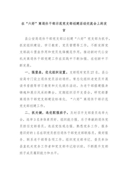 【七哥公文】2024年:在“六好”离退休干部示范党支部创建活动交流会上的发言+更多免费公文+VX:QiGeGongWen2024