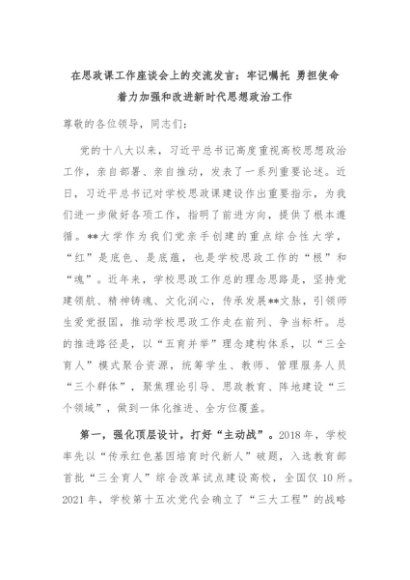 【七哥公文】2024年:在思政课工作座谈会上的交流发言:牢记嘱托 勇担使命 着力加强和改进新时代思想政治工作+更多免费公文+VX:QiGeGongWen2024