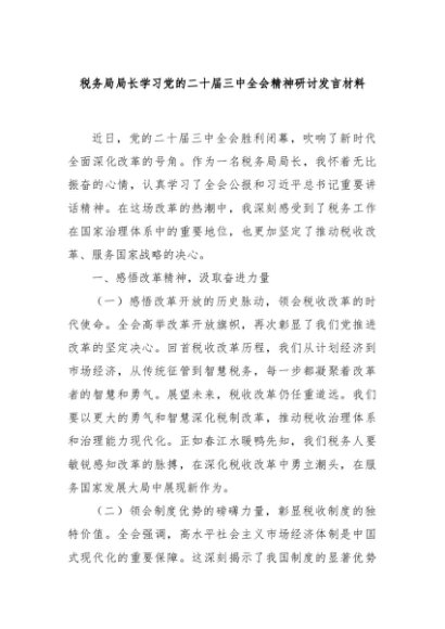/ 【七哥公文】2024年:税务局局长学习党的二十届三中全会精神研讨发言材料+更多免费公文+VX:QiGeGongWen2024