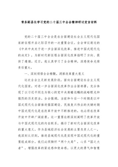 / 【七哥公文】2024年:常务副县长学习党的二十届三中全会精神研讨发言材料+更多免费公文+VX:QiGeGongWen2024