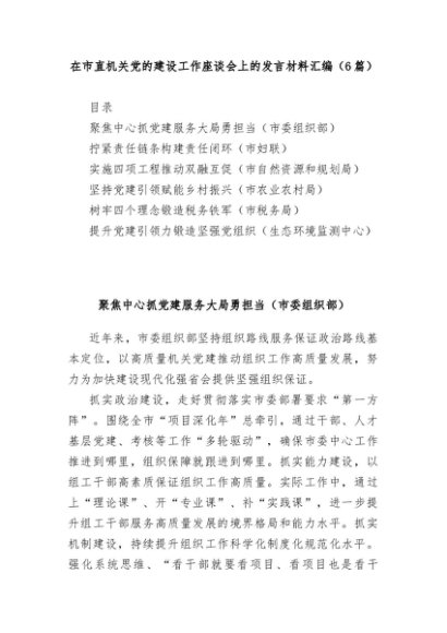 【七哥公文】2024年:(6篇)在市直机关党的建设工作座谈会上的发言材料汇编((市委组织部、妇联、自然资源和规划局、农业农村局、税务局、生态环境监测中心))+更多免费公文+VX:QiGeGongWen2024