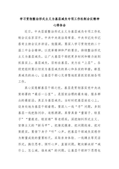 【七哥公文】2024年:学习贯彻整治形式主义为基层减负专项工作机制会议精神心得体会+更多免费公文+VX:QiGeGongWen2024