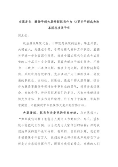 【七哥公文】2024年:交流发言:激励干部大胆开拓担当作为 让更多干部成为改革闯将攻坚干将+更多免费公文+VX:QiGeGongWen2024