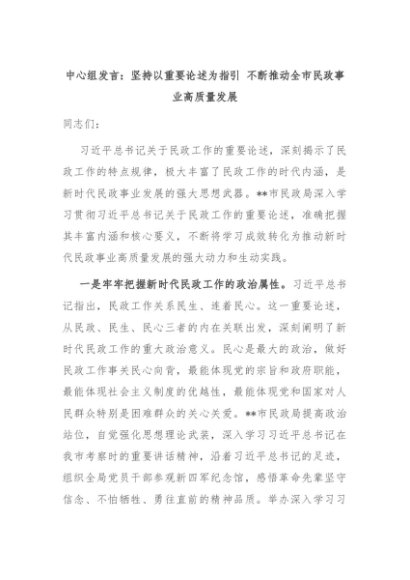 【七哥公文】2024年:中心组发言:坚持以重要论述为指引 不断推动全市民政事业高质量发展+更多免费公文+VX:QiGeGongWen2024